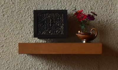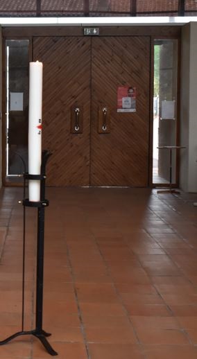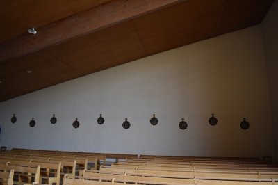 Sous un toit en appentis que prolonge l’entrée, la nef s’ouvre largement au nord par une grande verrière structurée par des poutres en bois répondant à celles qui, à l’intérieur, soutiennent le toit. De forme arrondie, elles atténuent la linéarité de l’ensemble.