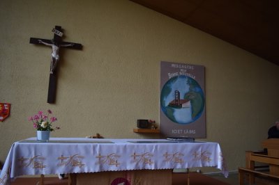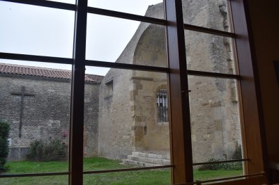 La verrière assure le lien entre cette église moderne et l’ancienne église : c’est ainsi que l’ensemble a été conçu. A travers elle, on peut voir depuis l’église moderne le jardin qui s’étend à la place de l’ancienne église et que clôt à l’est l’abside, ancien chœur de l’église.