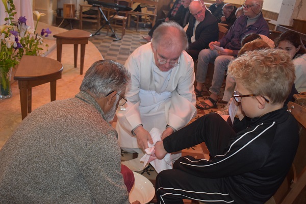 Le Jeudi Saint à Bouillé-Courdault nous avons pu participer à la messe en mémoire de la cène du Seigneur durant laquelle le prêtre a lavé les pieds de quelques fidèles.
