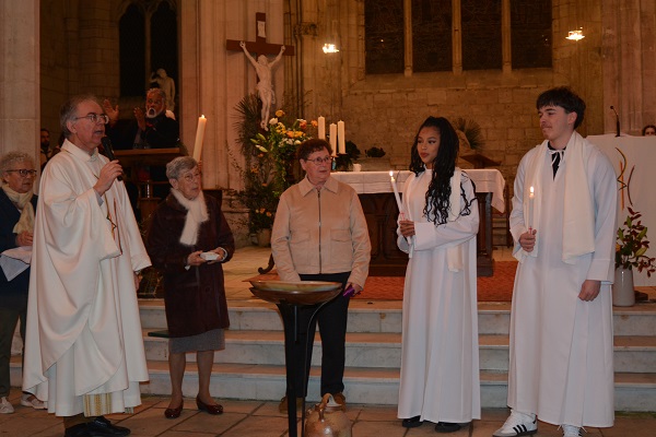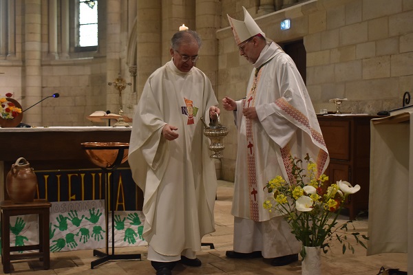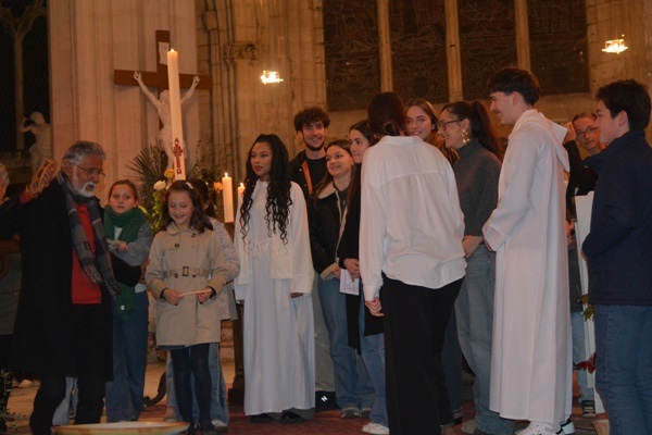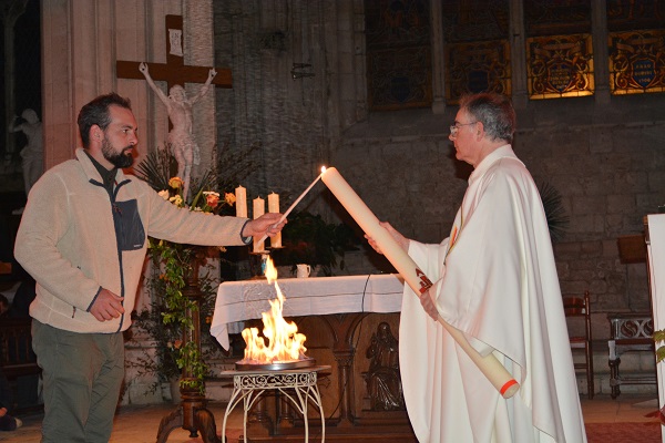 Le Samedi Saint, Veillée Pascale à Benet durant laquelle nous célébrons Pâques, passage des ténèbres à la lumière, victoire du Christ sur la mort. C’est pourquoi, dans la nuit, le feu et le cierge de Pâques sont allumés, puis la lumière est transmise aux fidèles. Durant la Veillée, Maé et Pacôme ont reçu les sacrements du Baptême, de la confirmation et ont communié au Corps et au Sang du Christ.