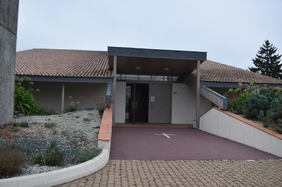 Sous un toit en appentis que prolonge l’entrée, la nef s’ouvre largement au nord par une grande verrière structurée par des poutres en bois répondant à celles qui, à l’intérieur, soutiennent le toit. De forme arrondie, elles atténuent la linéarité de l’ensemble.
