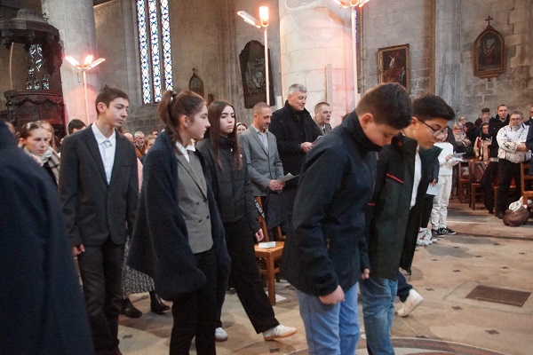 Le dimanche 1er décembre 2024 à Benet, pendant la messe, les 10 confirmands ont remis leur lettre de demande de confirmation à l’abbé Thierry afin qu’il la remette à Monseigneur Jacolin.