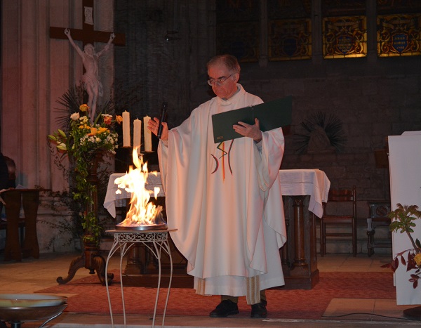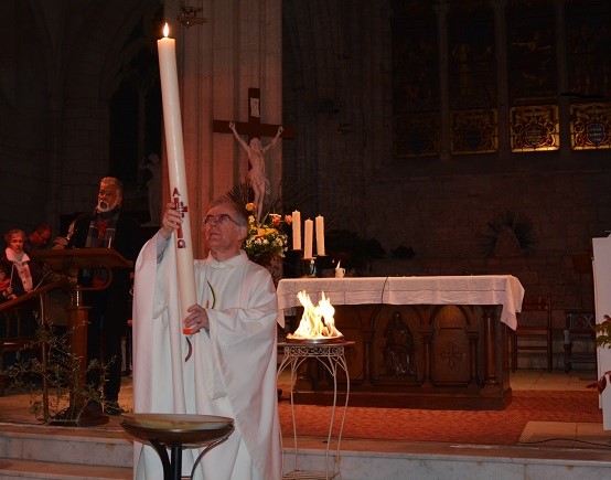 Le Samedi Saint, Veillée Pascale à Benet durant laquelle nous célébrons Pâques, passage des ténèbres à la lumière, victoire du Christ sur la mort. C’est pourquoi, dans la nuit, le feu et le cierge de Pâques sont allumés, puis la lumière est transmise aux fidèles. Durant la Veillée, Maé et Pacôme ont reçu les sacrements du Baptême, de la confirmation et ont communié au Corps et au Sang du Christ.