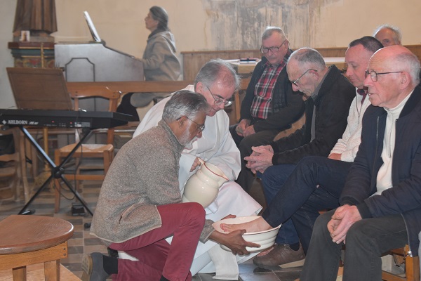 Le Jeudi Saint à Bouillé-Courdault nous avons pu participer à la messe en mémoire de la cène du Seigneur durant laquelle le prêtre a lavé les pieds de quelques fidèles.